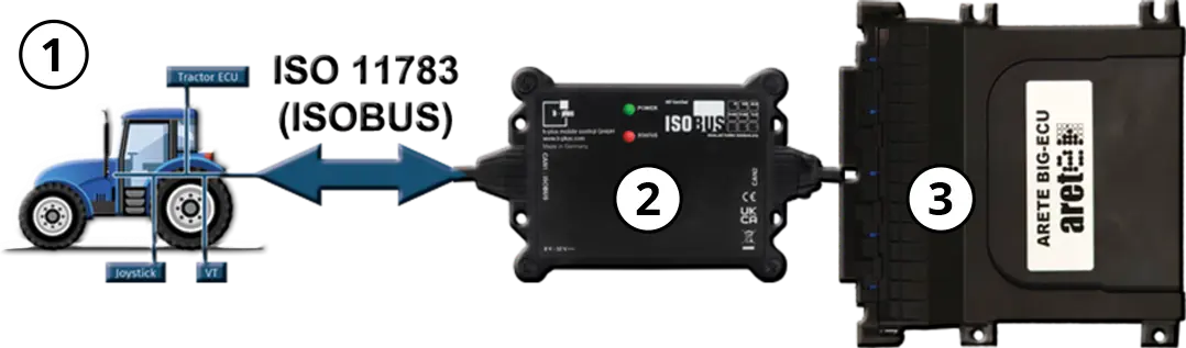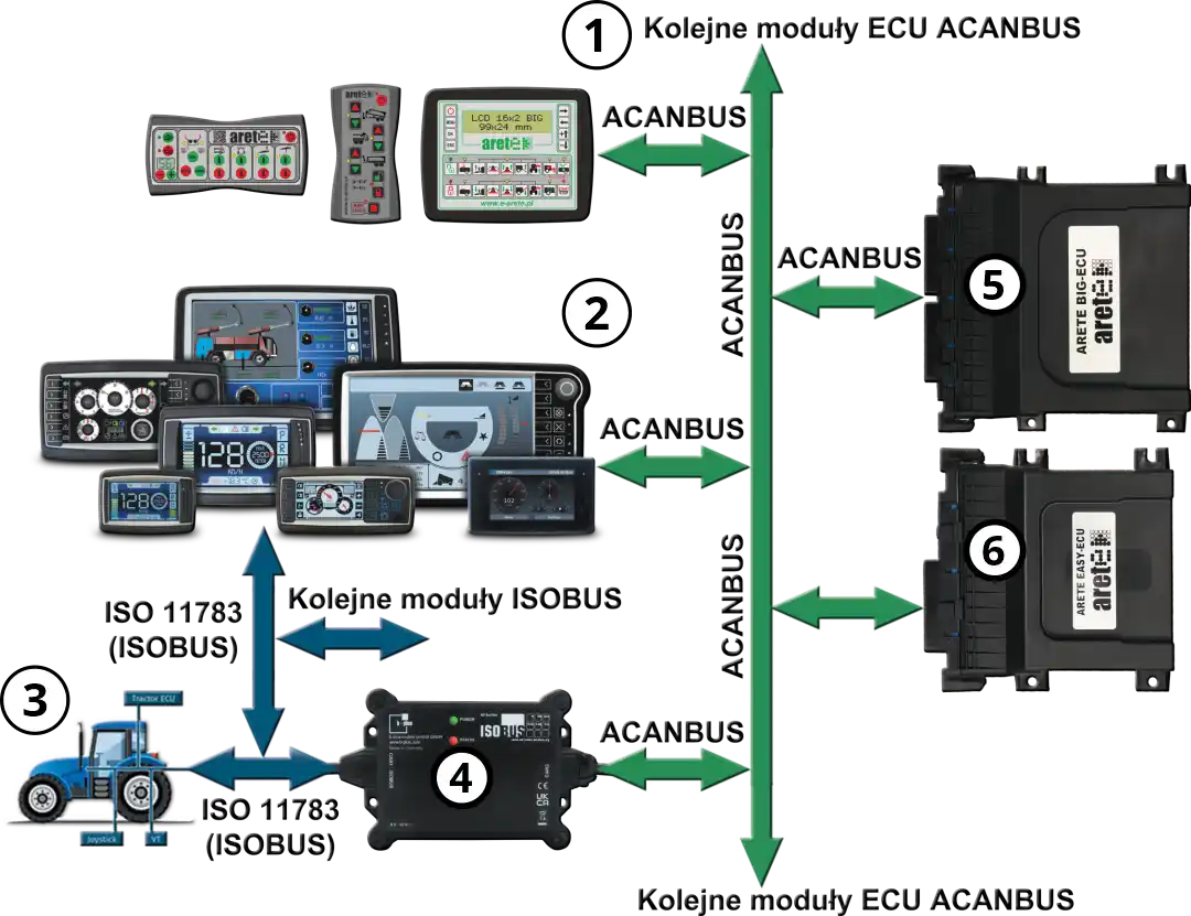 System sterowania „Każdy z każdym” jest autorskim opracowaniem firmy ARETE. System ten umożliwia współpracę dowolnej maszyny wyposażonej w jeden z modułów ECU firmy ARETE (5 i/lub 6) z dowolnym panelem z powyższej konfiguracji (1 panel ARETE) lub (2 panele OPUS bez UT). Po wpięciu modułu b-ISOBUS Micro CAN Gateway (4 firmy b-plus z dedykowanym oprogramowaniem) ECU’s mogą współpracować bezpośrednio z ciągnikiem wyposażonym w ISOBUS (3) lub z dowolnym typem panelu OPUS UT firmy TOPCON (2).Do prawidłowej współpracy w systemie ISOBUS panel musi posiadać właściwą wersję oprogramowania ISOBUS oraz funkcje wykorzystywane przez moduł ECU maszyny. Ponadto do prawidłowej pracy systemu niezbędna jest pełna kompatybilność programowa poszczególnych komponentów.Dzięki zastosowaniu tego rozwiązania producenci maszyn zyskują możliwość dowolnej konfiguracji sprzedażowej swoich produktów, bez ponoszenia jakichkolwiek dodatkowych kosztów wdrożeniowych.